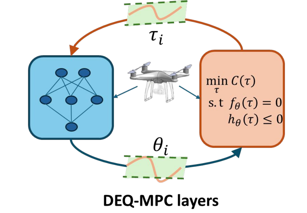 DEQ-MPC : Deep Equilibrium Model Predictive Control Swaminathan Gurumurthy, Khai Nguyen, Arun L Bishop, J Zico Kolter, Zachary Manchester CoRL 2025 [1] [pdf] [code] We propose a novel approach that co-develops the solver and architecture unifying the optimization solver and network inference problems. Specifically, we formulate this as a \textit{joint fixed-point problem} over the coupled network outputs and necessary conditions of the optimization problem. Through extensive ablations in various robotic control tasks, we demonstrate that our approach results in richer representations and more stable training, while naturally accommodating warm starting, a key requirement for optimal control problems. |